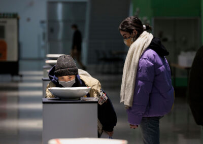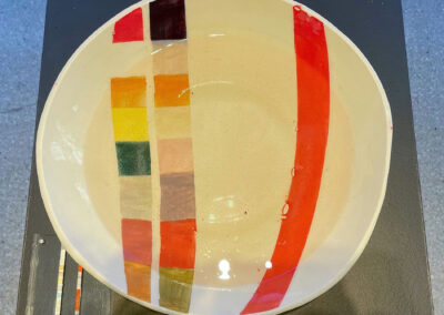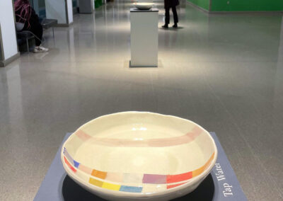 Large ceramic bowls that contain samples of water from Philadelphia’s rivers and streams, which was used for testing levels of pollution and bacteria. These bowls are glazed based off of the results from this testing.