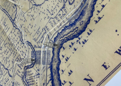 Glass map showing the current layout of Philadelphia’s waterways, layered over an enhanced map of the area from 1876.