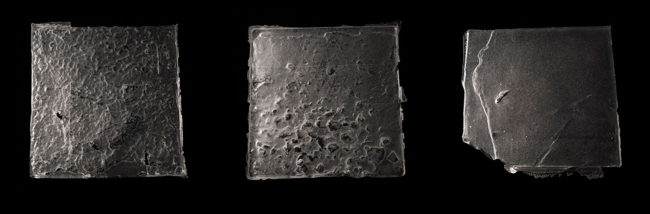 Alexis Deane’s “glass photographs” are castings of riverbed samples from North Carolina’s French Broad River. They illustrate the difference between the intricate, highly textured bed of the headwaters and the scoured out, more barren beds near urbanized and industrialized areas.