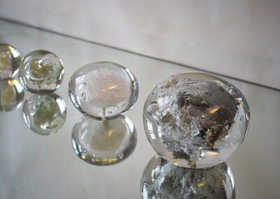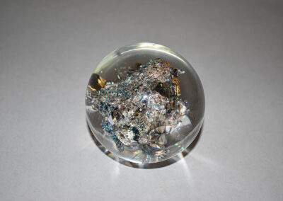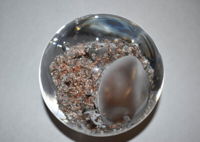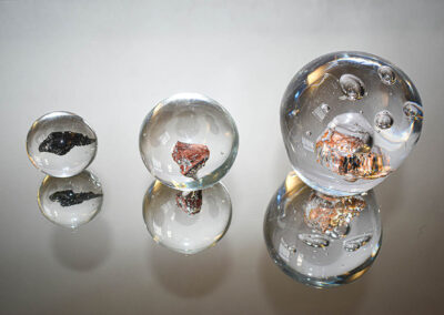I utilize found materials by mining gemstones from different locations and encasing them in glass using traditional and experimental glassblowing techniques. Each gemstone responds differently to molten glass: some will crack, off-gas and explode. These reactions make what society deems precious, completely unrecognizable. Gathering the stones from the earth and the ethics surrounding mining are an important aspect in my work. By exploring the world of mining, I am highlighting the practice of extracting a sustainable supply of minerals that are key to a low-carbon energy future. The glass in my work reflects its non-toxic nature and ability to be recycled infinitely. Integrating salvaged waste materials is a prime element in my creative practice. After burning the gems, they no longer shine as they did before. Does the value of the gems change now that it is destroyed inside the glass?