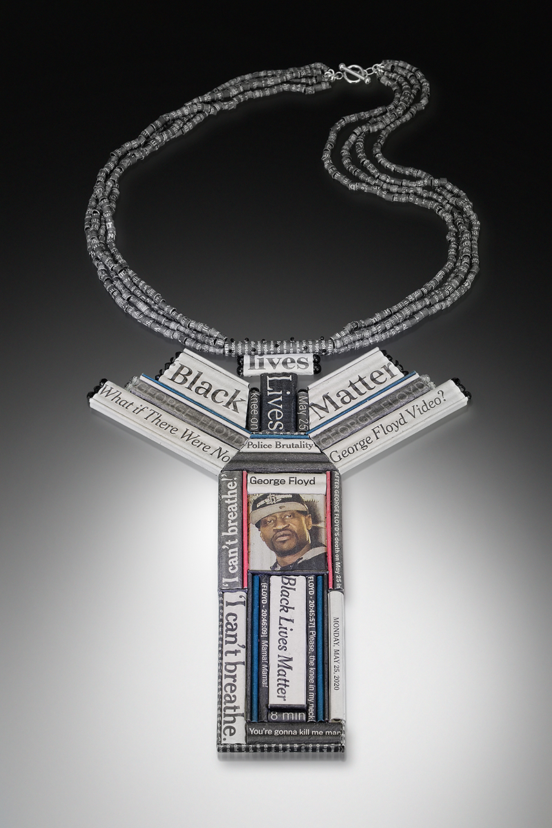 Holly Anne Mitchell’s recycled newspaper jewelry inventively reuses waste, often with astute social commentary on, for example, the power of advertising or the critical need for environmental justice. Hilary Pfeifer taps a network of furniture makers, sculptors, spoon carvers and turners for castoffs for her eye-catching sculptures. Lisa and Scott Cylinder deconstruct and imbue found objects with an ironic sense of nostalgia. Tara Locklear designs playful jewelry with industrial materials, Sarah Djarnie-Brown’s handmade dolls wear garments of scrap fabric that “come from every walk of life,” and Susan Lenz Dingman turns household objects into colorful wall hangings.